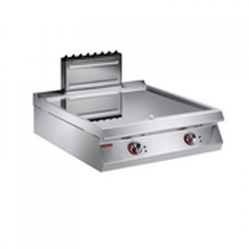 18-10 stainless steel with 20/10 top. Satin finished compound (Aisi316L+FE) s/steel cooking plate. Heating with two groups of elements below the plate in AISI 304L s/steel. Thermostat temperature control 100° to 270*C and safety thermostat. Delivered with plate plug.