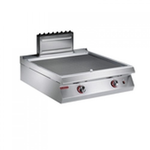 18-10 stainless steel with 20/10 top. Satin finished Fe510D steel cooking plate. Heated by two burner groups controlled by modulating thermostat valve. Temperature control from 140 to 340°C. Delivered with plate plug.
