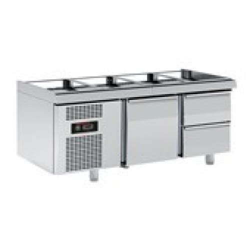 Refrigerated counter endowed with frame suitable to support 4 top elements35x70cm.One-piece insulated structure GN 1/1 in AISI 304 stainless steel. External finned evaporator; defrosting by air and automatic evaporation of condense drain. Digital thermometer/thermostat. Temperature range 0/+10°C. Each compartment equipped with one couple of guides and one shelf. One door+ two drawers. Room temperature +43°C (Climate Class 5, Room +40°C and 40% RH)